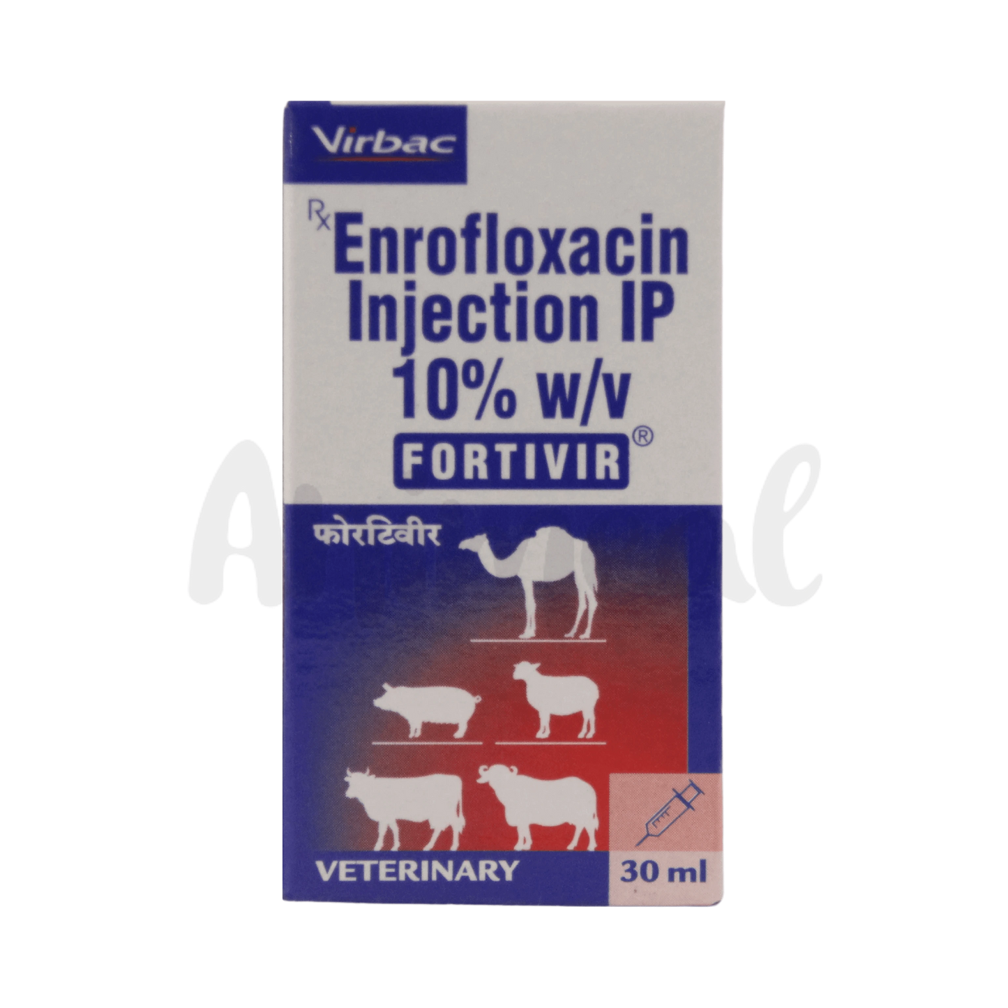 FORTIVIR INJ is a long-acting antibiotic designed for a broad spectrum of animals including horses, cows, bulls, buffaloes, pigs, goats, sheep, and camels. It stands out for its new drug delivery technology, making it a top choice for veterinarians and pet owners. FORTIVIR INJ is renowned for its efficacy in treating infections caused by mycoplasma and other bacteria, making it an essential part of animal healthcare solutions offered by Animeal.